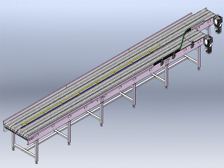 链板输送机是一种以标准链板为承载面,由马达减速机为动力传动的传送装置。链板式输送机,由动力装置(电机)、传动轴、滚筒、张紧装置、链轮、链条、轴承、润滑剂、链板等等构成。其中带动物料的输送的主要的两个部分为:链条,利用它的循环往复运动提供牵引动力;金属板,作为输送过程中的承载体。可以通过多列链板并行,使链板输送机做的很宽并形成差速,利用多列链板的速度差使多列输送在无挤压的情况下变为单列输送,从而满足饮料贴标、灌装、清洗等设备的单列输送的要求,我们可以将两条链板输送机的头尾部做成重叠式的混合链使得瓶(罐)体处于动态过度状态,使输送线上不滞留物料,可以满足空瓶以及实瓶压力和无压力输送。